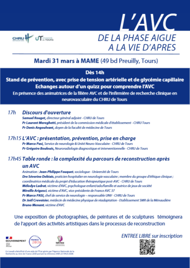 La prochaine rencontre « L’AVC, de la phase aiguë à la vie d’après », se tiendra le mardi 31 mars de 17h à 20h, à MAME – 49 boulevard Preuilly, Tours.